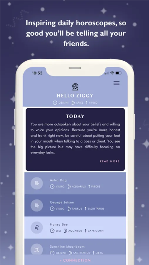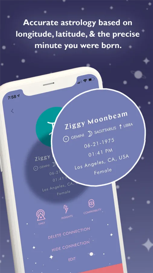 - Manually add as many connections as you’d like to read their birth charts, check daily horoscopes, and explore compatibility