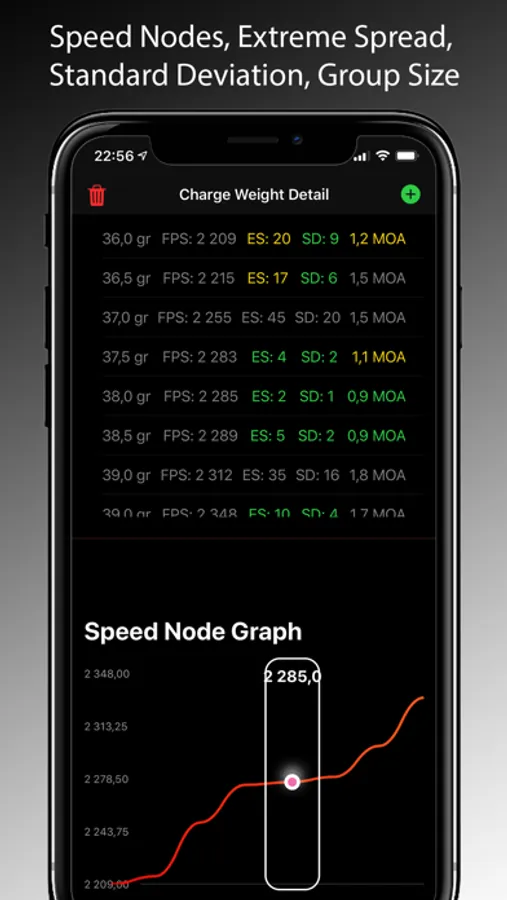 Sweet Spot is a rifle reloading tool that analyses your chronograph speeds, group sizes and charge weight. It calculates the AVERAGE VELOCITY, EXTREME SPREAD, STANDARD DEVIATION and shows velocity charts to visually see speed nodes on your rifle.