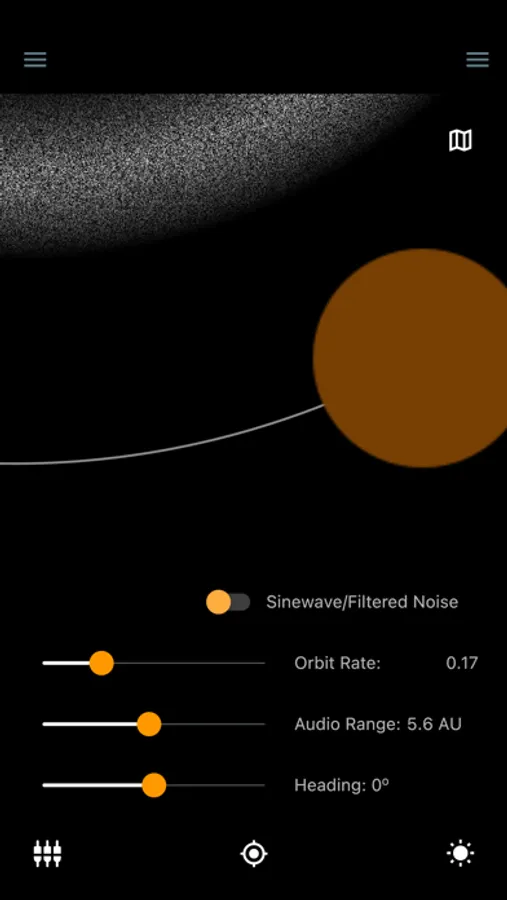 Wanderers invites the mobile listener to explore a sonification of the Solar System in which the relative mass and orbital period of the planets in our Solar System are expressed sonically, with each celestial body having its own “soundprint”. As the mobile listener wanders, and the sonified celestial bodies move at their relative orbital speeds, the participant hears a dynamic soundscape where the volume and direction of the sounds changes depending on the participant’s position and perspective. Participants may toggle sounds on/off using the right menu, and using the slider tools (bottom left icon) may alter parameters of the sonification including: speed of orbit, audio range: radius within which sounds can be heard, sound palette used, and heading.