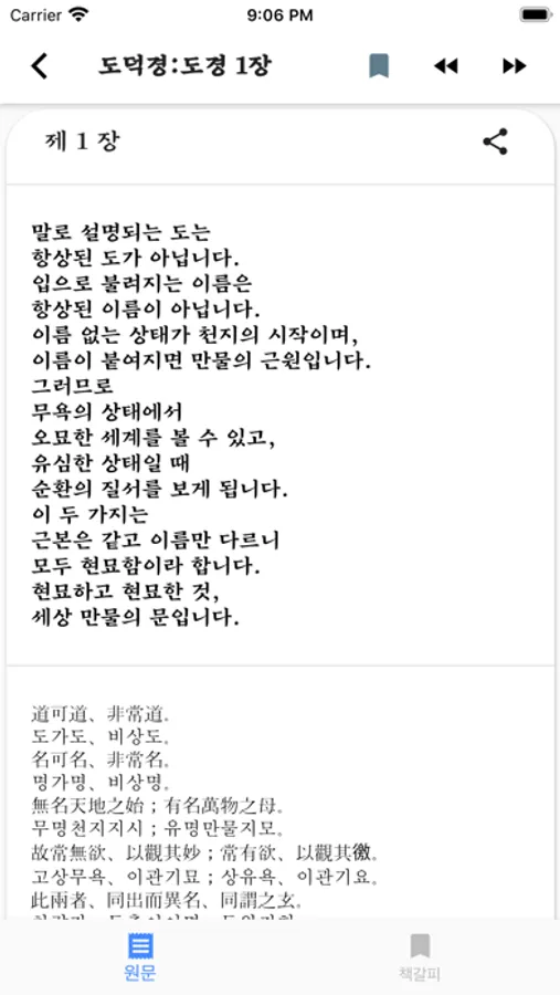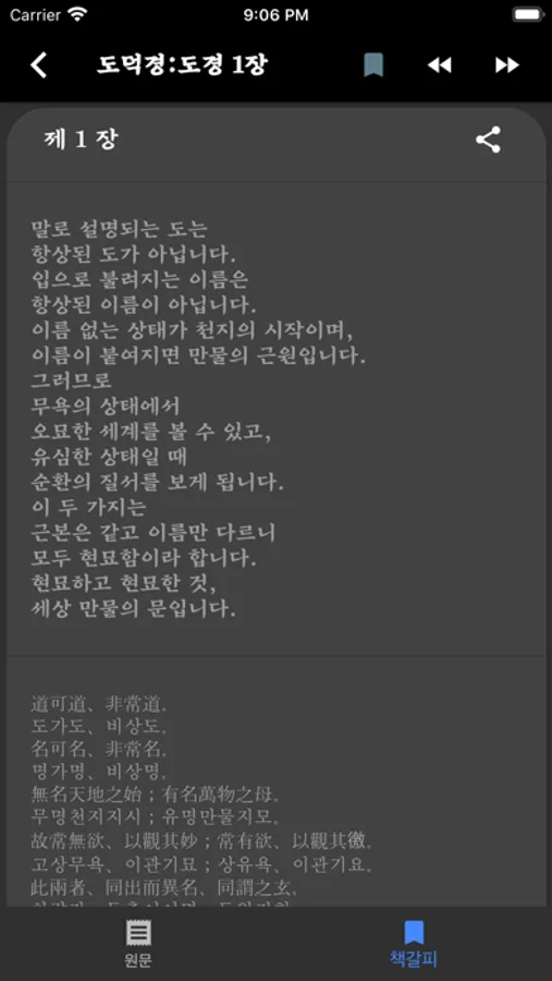 - 한글해설을 보지 않고 한자 원문만 보도록 설정할 수 있습니다.