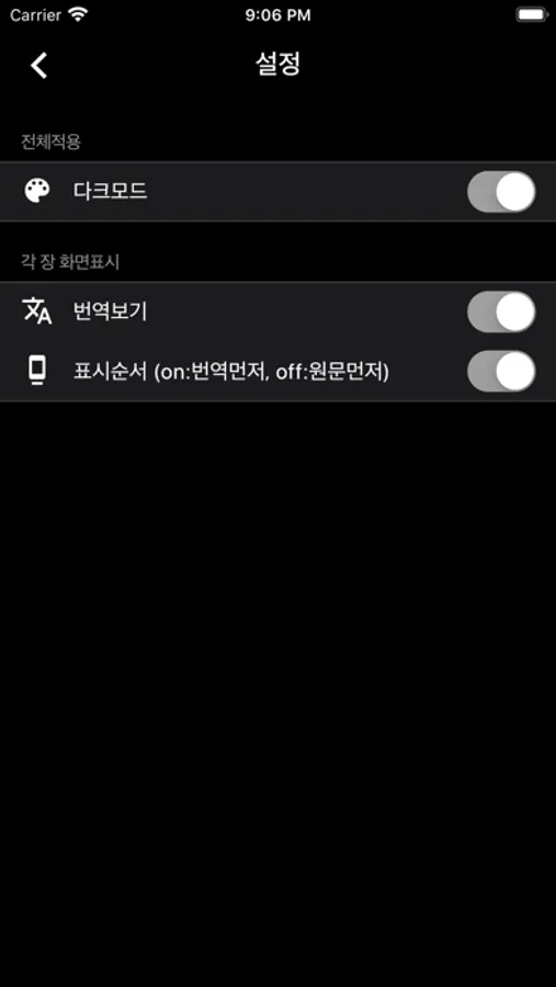 - 다크모드를 선택해서 어두운 환경에서 눈이 부시지 않게 읽을 수 있습니다.