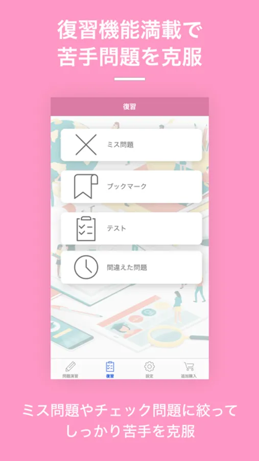 ミス問題だけを復習、苦手な問題をチェックしてチェック問題のみ復習もできるので効率的に苦手を克服できます。