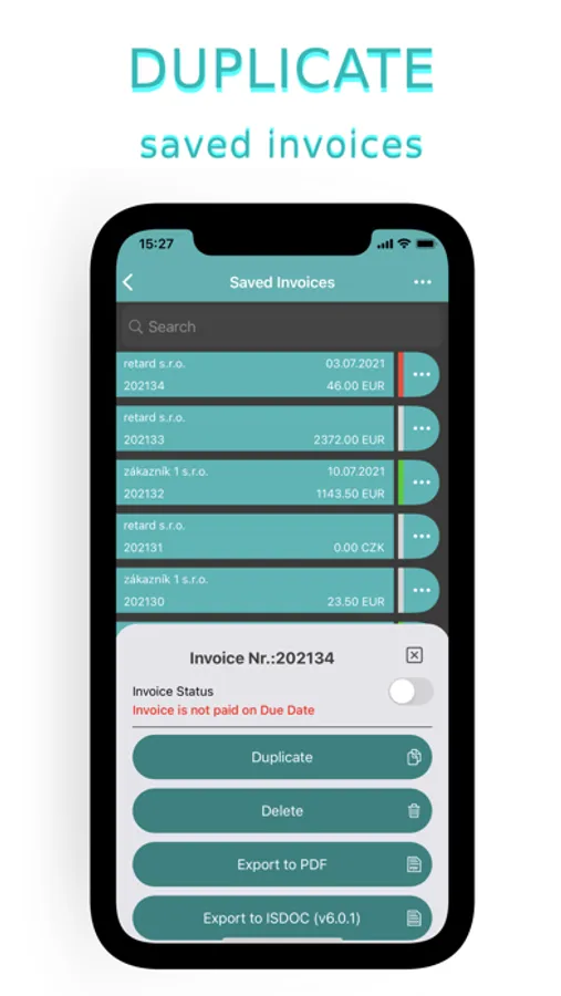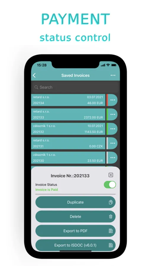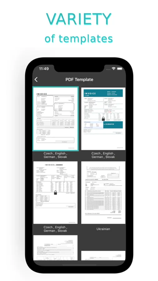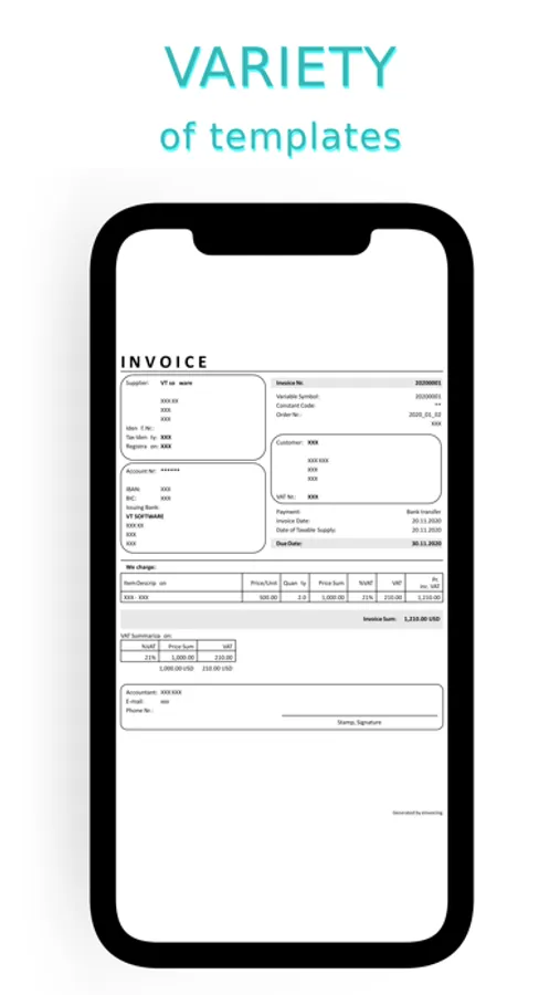 This App allows you, with the help of predefined templates, easily create invoices in various currencies and various languages (English, German, Czech, Slovak, Russian and Ukrainian), manage them, generate them as the pdf format and optionally export them into the ISDOC format.