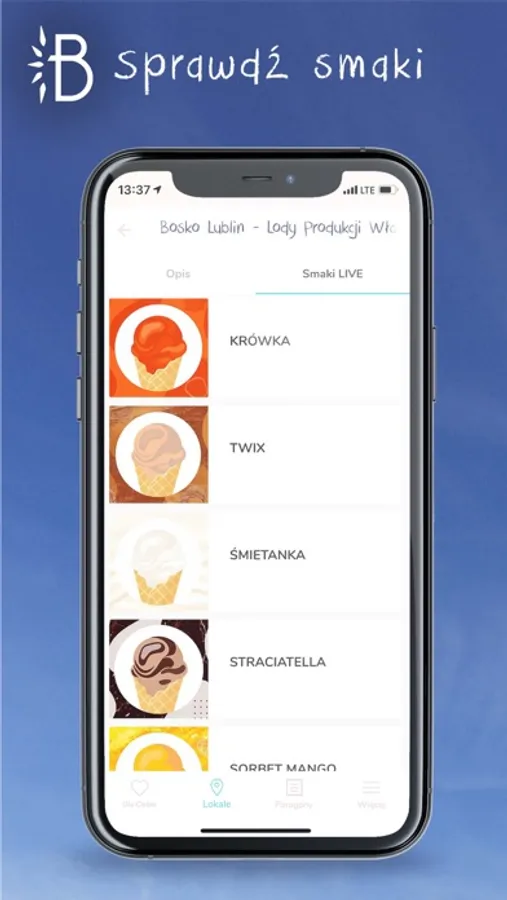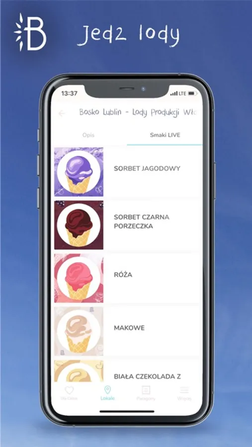 • W zakładce Lokale otrzymasz informacje o lokalizacji i godzinach otwarcia najbliższego punktu oraz poznasz aktualne smaki lodów