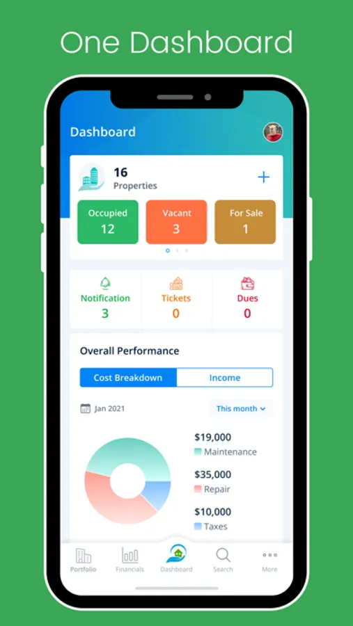 4. Financials such as Transactions (income and expenses), dues, reminders, property performance, different currency as per property location.
