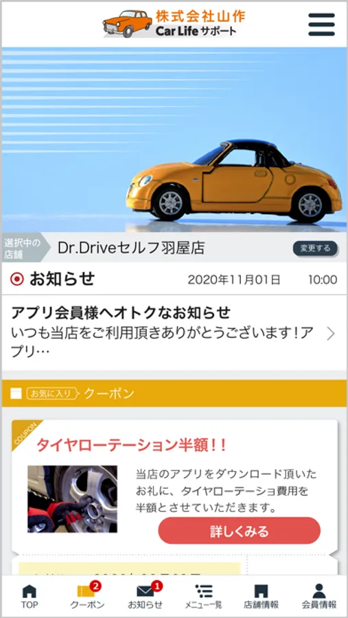 当社の公式アプリ「山作CarLifeサポート」ではアプリで簡単に洗車・コーティングなどのご予約や愛車のメンテナンス管理が可能の他、当店で利用いただけるお得なクーポンや各種メニューの割引情報を配信しております。