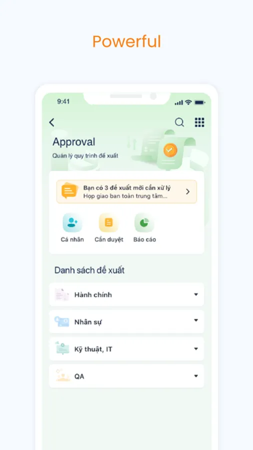 - Nhóm giải pháp quản lý hành chính: Cung cấp các tính năng năng quản lý văn bản, tài liệu, xử lý và phê duyệt yêu cầu, đề xuất, quản lý tài sản doanh nghiệp,...