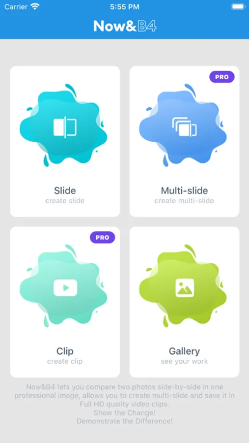 Now & B4 lets you compare two or more photos before and after the transformation in one professional slide or multi-slide and create Full HD quality video clips.