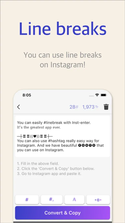 Decorate your posts using your own popping fonts and emoticons, and easily manage hashtags.