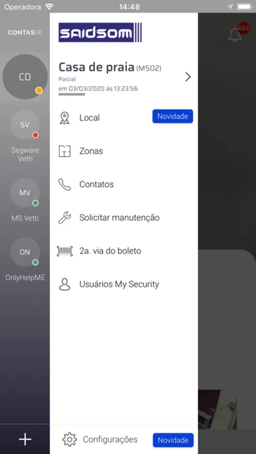 O My Saidsom é um aplicativo móvel onde o cliente monitorado pode acompanhar diretamente via celular ou tablet todas as atividades do seu sistema de segurança. Por meio do aplicativo, é possível saber o status do painel de alarme, armá-lo e desarmá-lo, visualizar as câmeras ao vivo, verificar eventos e ordens de serviço abertas, além de realizar chamadas telefônicas para contatos cadastrados no seu perfil. É a segurança que você precisa na palma da sua mão.