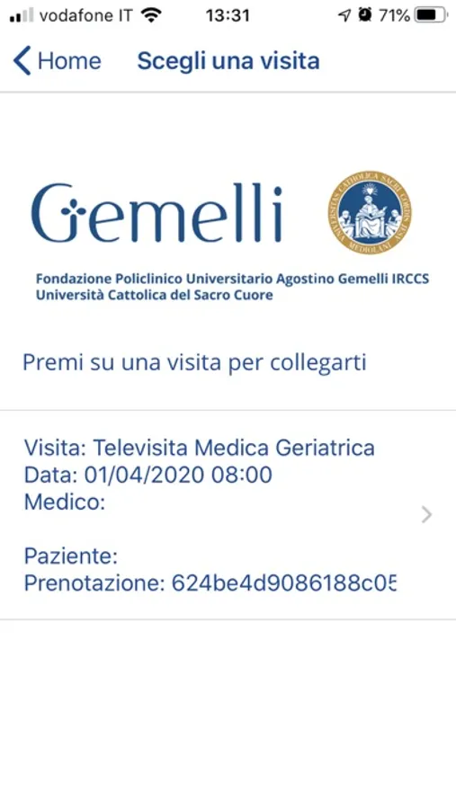 Scaricando l’app VISPA è possibile effettuare una visita a distanza con uno specialista della Fondazione Policlinico Gemelli- IRCCS. La visita specialistica a distanza con i nostri specialisti, riduce i tempi, i costi e i disagi del viaggio per i pazienti e per i loro familiari. L’appuntamento è privato e confidenziale; tutte le fasi della trasmissione e raccolta dei dati dell’assistito sono riservate e nel rispetto della privacy.