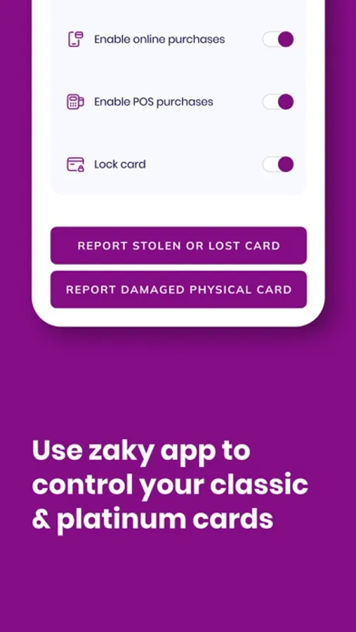 Take charge of your Zaky card with features like balance inquiry, e-pin, lock/unlock, and transaction history.