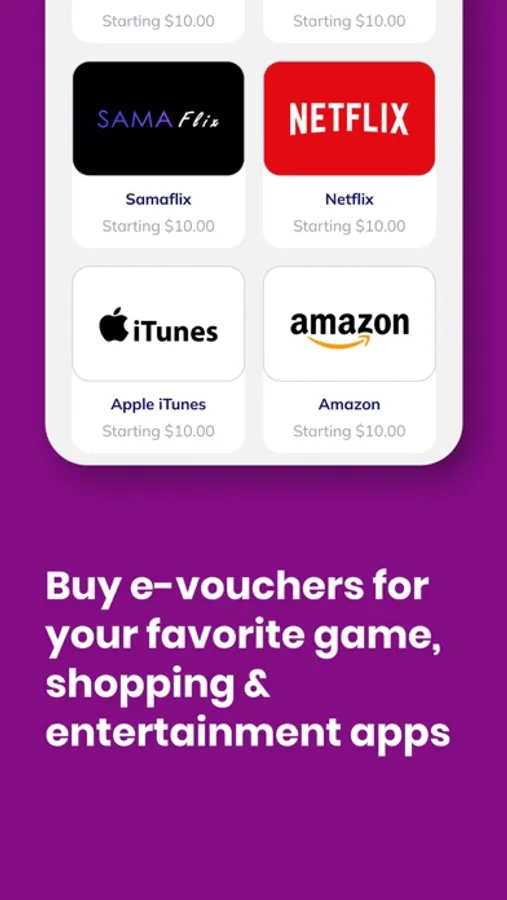 Purchase e-vouchers for your favorite gaming, shopping, and entertainment apps, such as iTunes, PlayStation, Xbox, Amazon, Netflix, and more.
