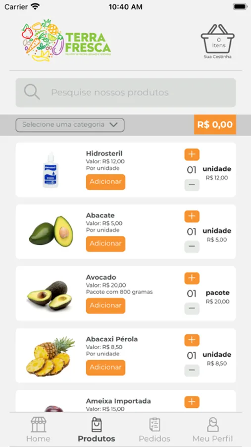 Faça seus pedidos para a Terra Fresca escolhendo os itens necessários e a melhor data de entrega. É simples, rápido e seguro!
