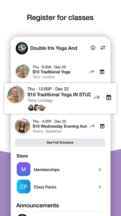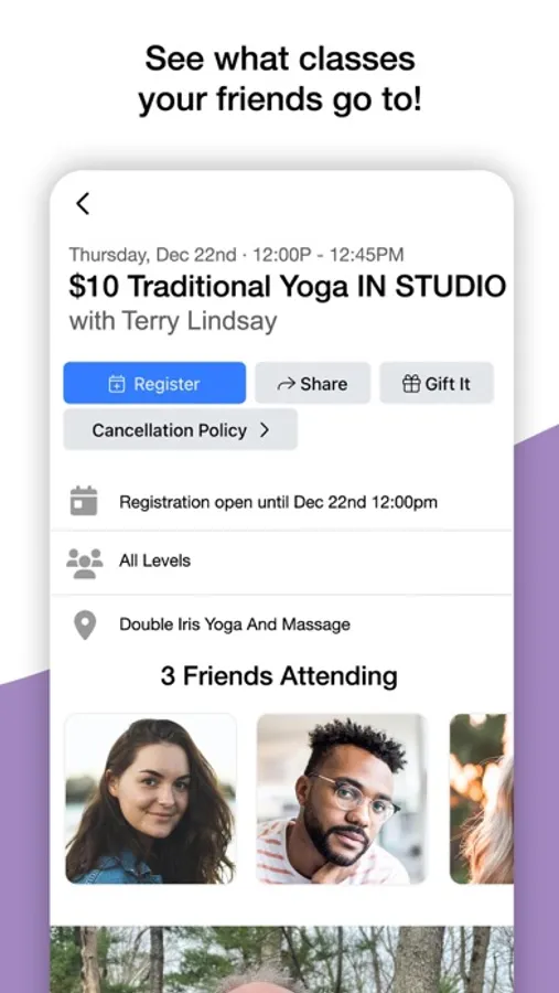 Quickly and efficiently sign up for yoga classes and massage appointments at Double Iris Yoga and Massage, LLC at the Charles Town or original Shepherdstown location in West Virginia. Joining our socially driven smart app allows you to buy classes or massages for yourself and loved ones, invite friends to come to classes, see what classes your friends are attending, and makes it so that you can share your positive experiences with our community right from the app. Staying connected and organized has never been easier for your healing journey.