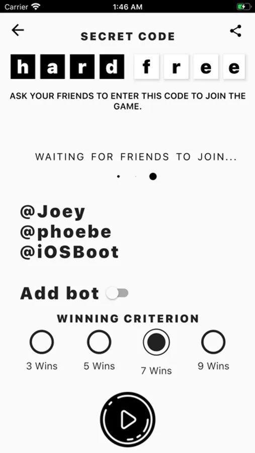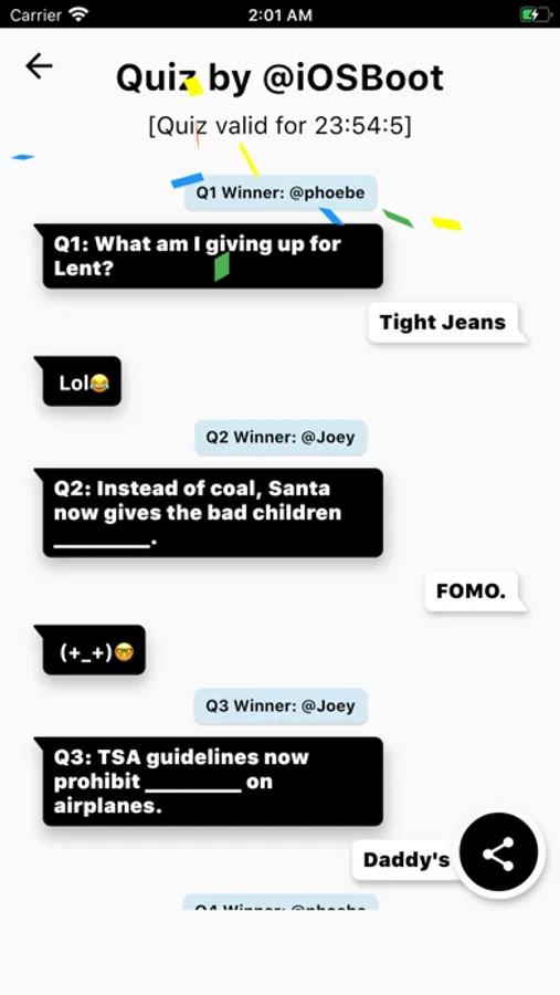- One can create a quiz of 5 funny (custom if needed) questions and share the code with his/her friends.