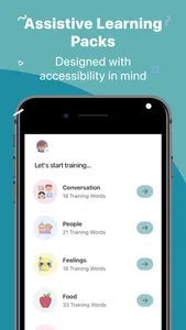 The app features 50 word packs that we call "assistive card packs". Using this carefully curated packages like; Conversations, Family, Foods etc. your child can learn while enjoying the cute illustrations.
