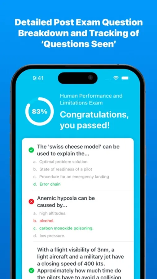 At the end of each exam you'll get a clear breakdown of which questions you answered correctly and which questions need more work so you can spend your ground school time studying more efficiently.