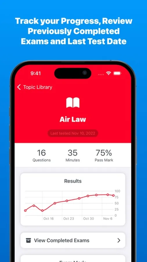 All your practice results are saved locally and displayed on a chart so you can see how your results are trending over time. PPL Exam Preparation also displays all you topic averages right from the topic library screen so that you can quickly identify which topic needs more work.