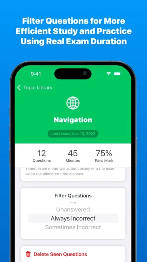 Filter questions to include only those that you always answer incorrectly so you can study more effectively for exams. You can also choose to filter by unseen questions to ensure that you have covered all the questions in the bank.