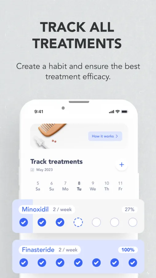 * Track any treatment for hair loss, including natural remedies, supplements, or medical treatments, using an easy-to-use tracker to help you create a habit and ensure the best treatment efficacy.