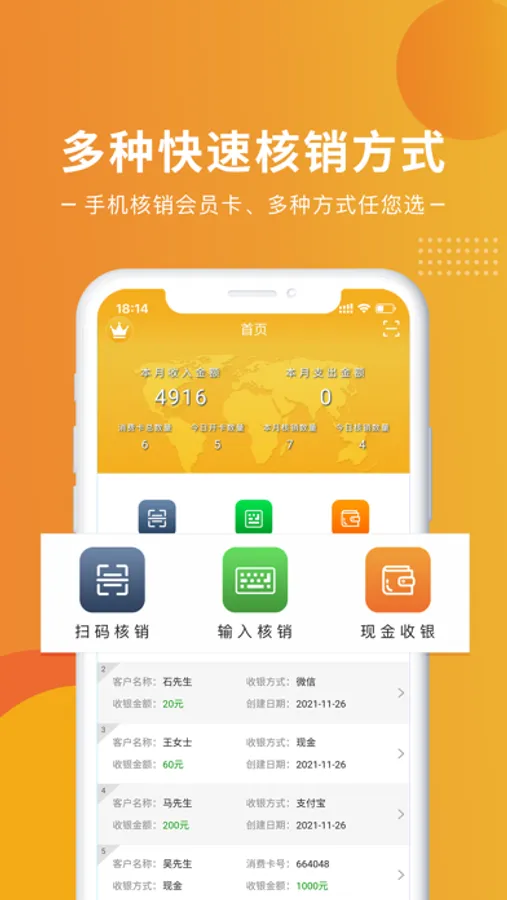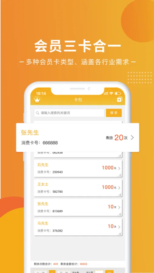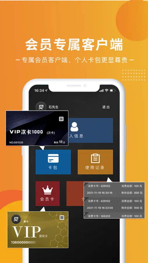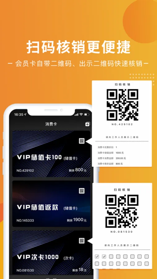 2、会员卡消费(手机即可核销会员卡,会员名下可以有多种不同类型的会员卡)