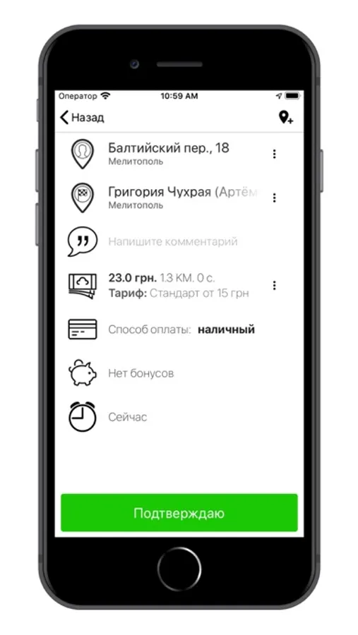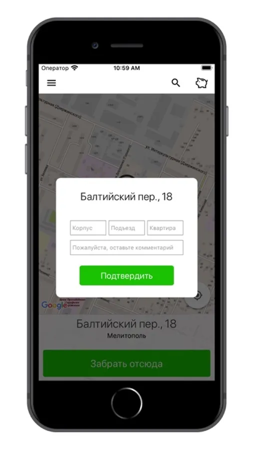 - Нажать кнопку для вызова такси и подтвердить адрес.