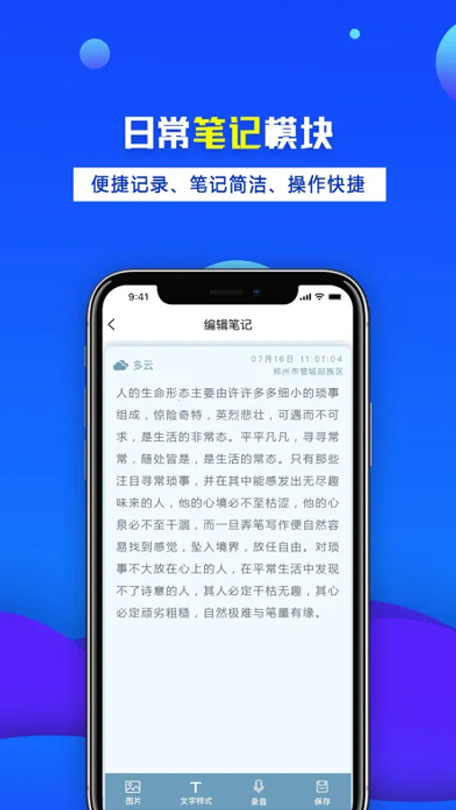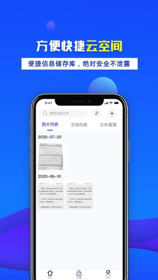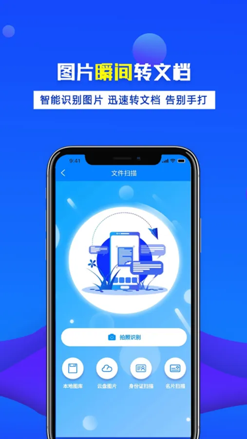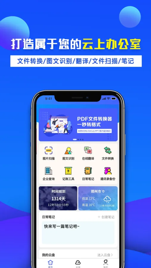 主要功能有照相和图片扫描,通过手机拍照将文件轻松制成扫描件;文件类型互相转換,PDF和Word等文件互相转化再也不用发愁;云盘存储文件方便快捷,随传随存,随存随用;还可以扫描照片识别文字。此外还提供了文字翻译功能,并且添加了事件提醒,可以随手添加图片笔记,提高工作效率。适用于各种办公人群。