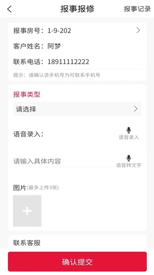 2、 报事报修:只需动动手指即可第一时进行报事报修处理,可同步上传现场故障图片以及故障情况描述,提交订单后,可随时查看订单进程。