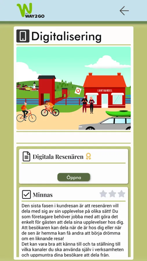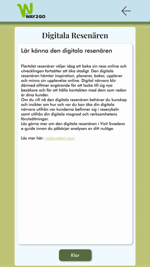 Den digitala revolutionen har bara börjat. Våra gästers liv, konsumtion och informationssökande flyttar ut i det digitala landskapet. Utmaningen de kommande åren kommer att vara att följa med dem dit, och finnas i alla de kanaler och forum där våra potentiella gäster uppehåller sig. Det övergripande fokusområdet digitalisering innebär att skapa nya affärsmodeller, kommunicerar och säljer upplevelser i Dalarna samt hur vi använder ny teknik för att förstärka och fördjupa våra upplevelser och erbjudanden före, under och efter ett besök i Dalarna. Nulägesanalysen i appen är ett verktyg som ger dig prioriterade åtgärdsförslag på du stärker ditt företags digitala närvaro.