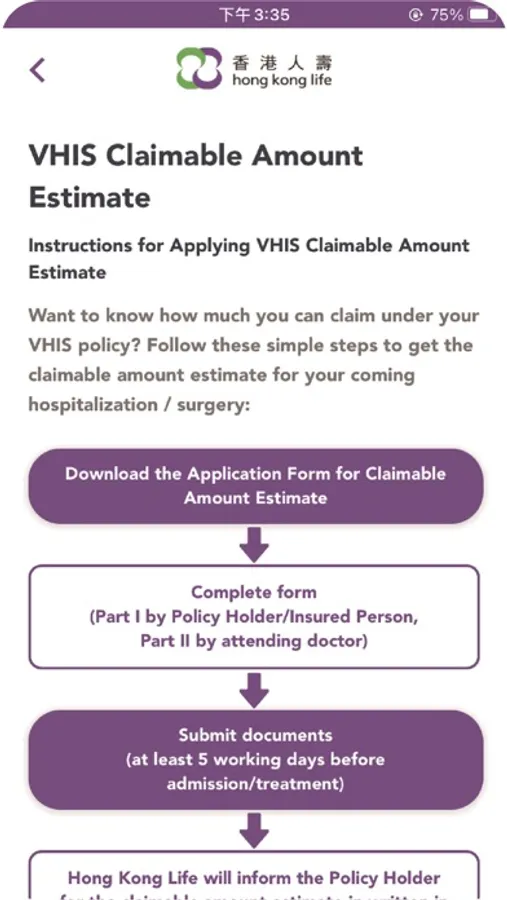 Prior to receiving medical services, customers may apply for an estimation of their claimable amount via the App for an anticipatory budgeting.