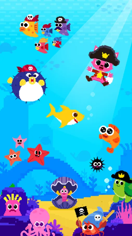 Baby Shark 8BIT is an arcade game where Baby Shark find various underwater friends while avoiding obstacles in the sea. Meet various friends in the sea, and fill your own sea with friends!