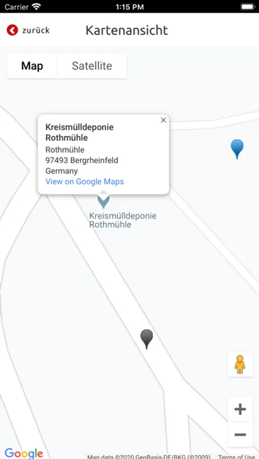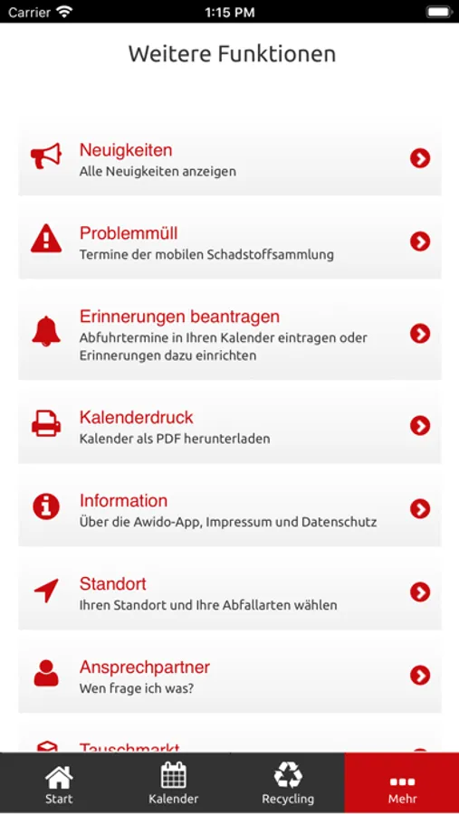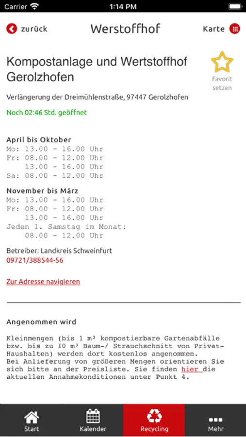 * Annahmestellen für Abfälle aller Art mit Ortsangabe und Öffnungszeiten, inkl. Kartenansicht und Navigation.