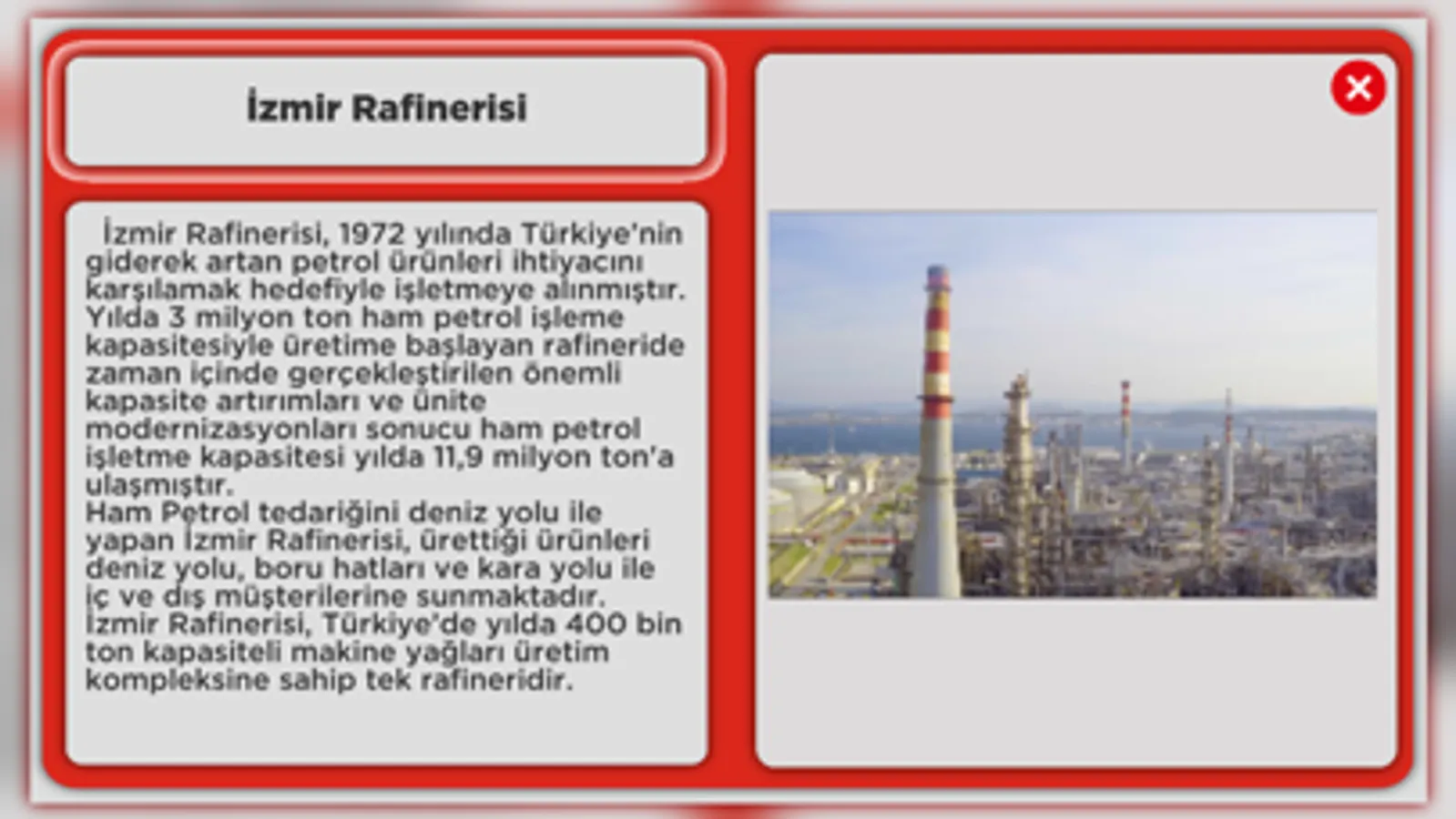 Bu uygulama sayesinde rafinerilerimiz hakkındaki bilgiler artık her zaman yanınızda! İnteraktif harita üzerindeki kare kodu okutarak rafinerilerimiz hakkındaki detaylı bilgilere ulaşabilirsiniz.