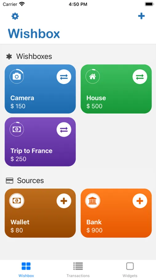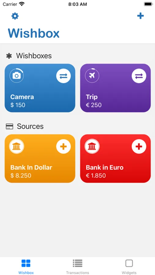 You start by creating a Wishbox item like a trip. Add the amount you wish to collect and then the target date, or the fix amount you can deposit per month. You can then virtually send money from your wallet or bank, or any other source you have and track the amount you have collected from each source.