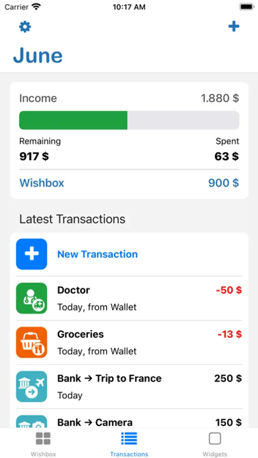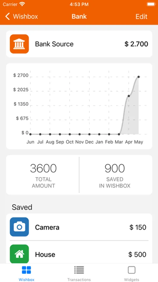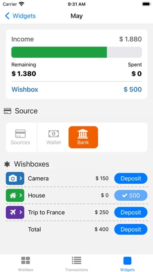 Finally check your progress from the home screen or through in-app widgets. There are also helper widgets that you can use, for example to easily deposit into multiple Wishbox items for current month.