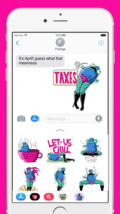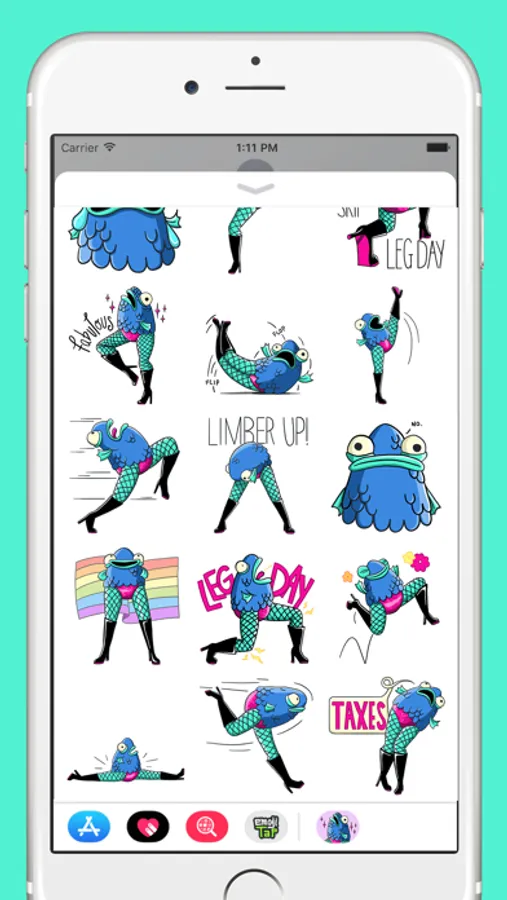 That fish. Those legs. They're ready to add some serious fin to your text messages! Pack includes 4 animated and 20 static stickers: