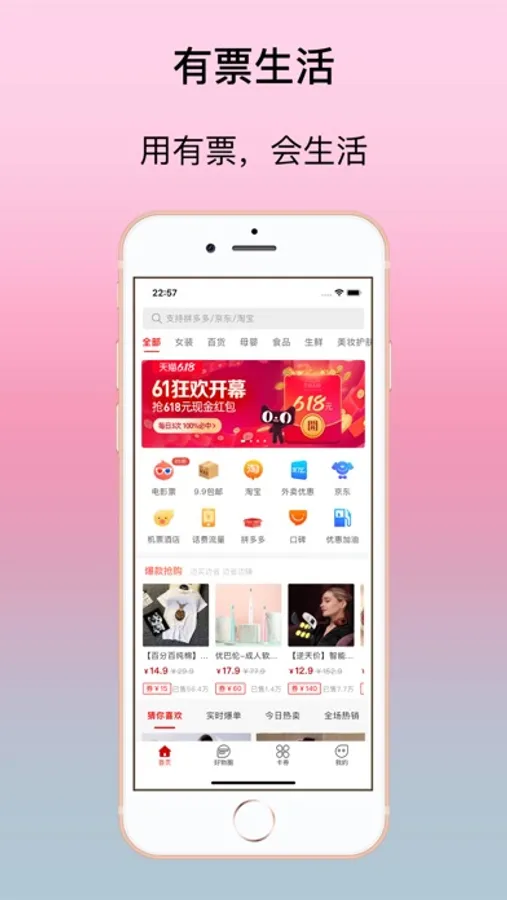 有票生活是一家以“让购物更实惠”为核心理念的社交电商导购平台,聚焦海内外优质品牌,链接各大电商巨头,甄选全球好货,汇集亿万优惠券,辐射消费购物、本地生活、智能零售等多个板块,是一款覆盖用户衣食住行的服务APP。