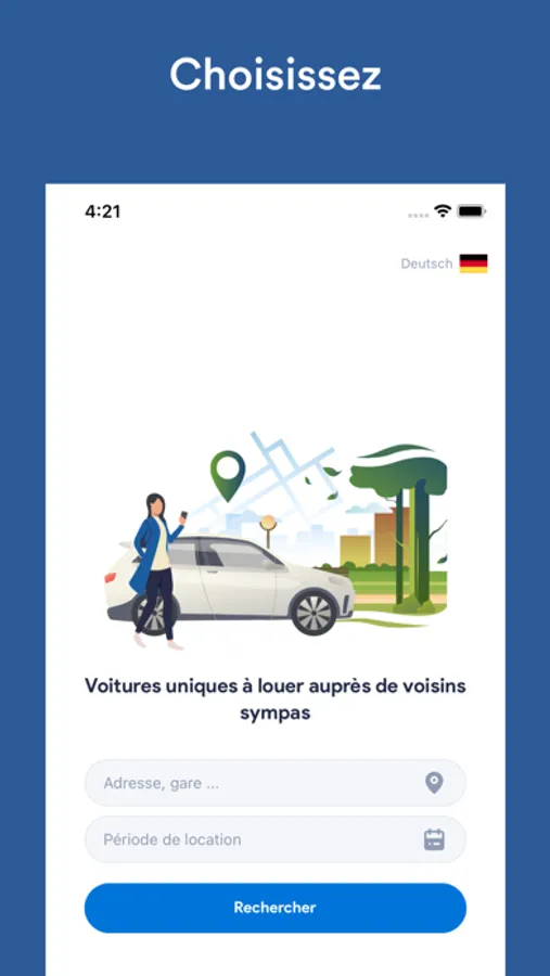 Louer une voiture avec 2EM est rapide et facile. Inscrivez-vous sur l'application de location de voiture avec vos données de connexion, puis spécifiez votre adresse et la période de location que vous désirez. Ensuite, validez votre choix pour que l’application vous propose une liste de voitures disponibles proches de chez vous. Il vous suffira de choisir la voiture qui correspond à vos besoins afin de demander une réservation.