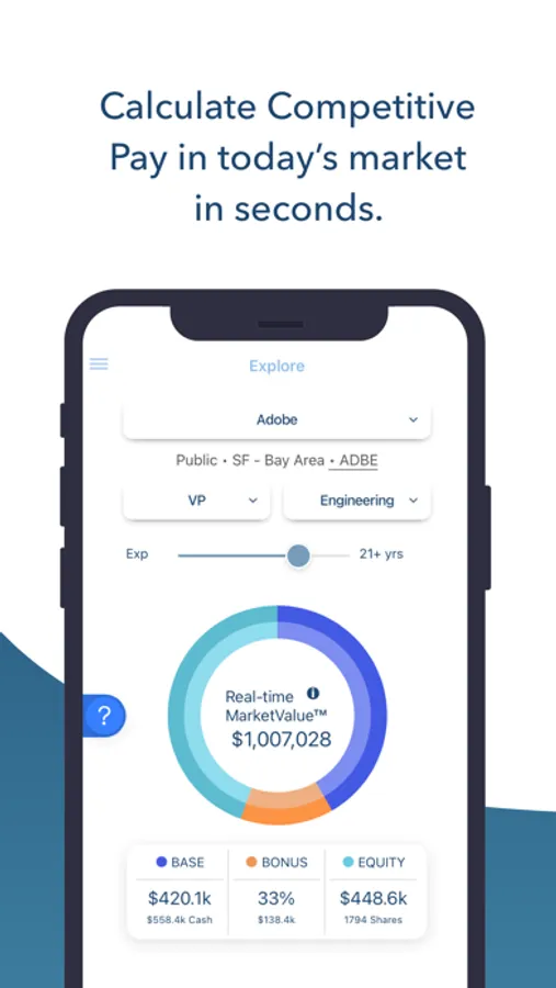 Dealmaker™ links to a real-time marketplace for compensation in Tech. Dealmaker™ displays competitive pay in as little as 2 clicks. Dial-in the most precise pay metrics by selecting company, level, function and experience. Tune rank for finer calibration.