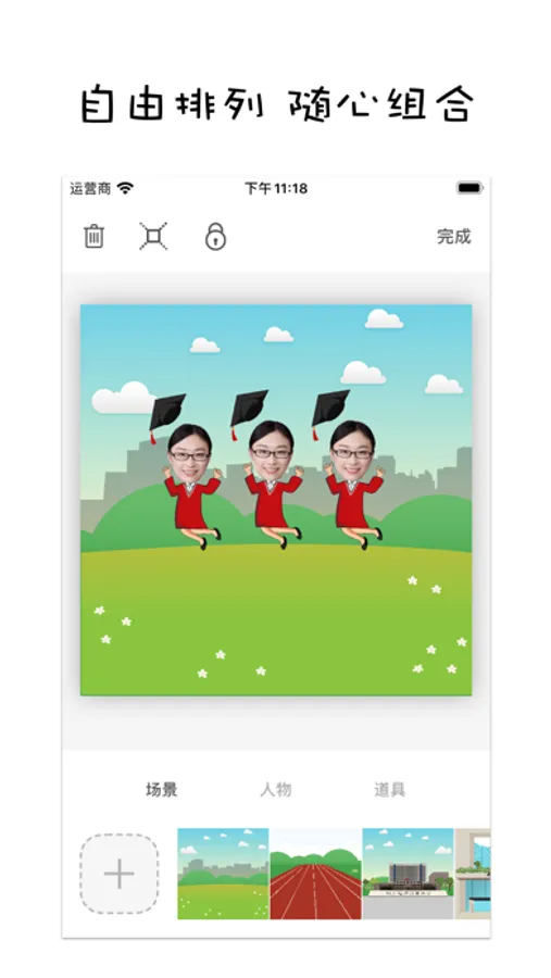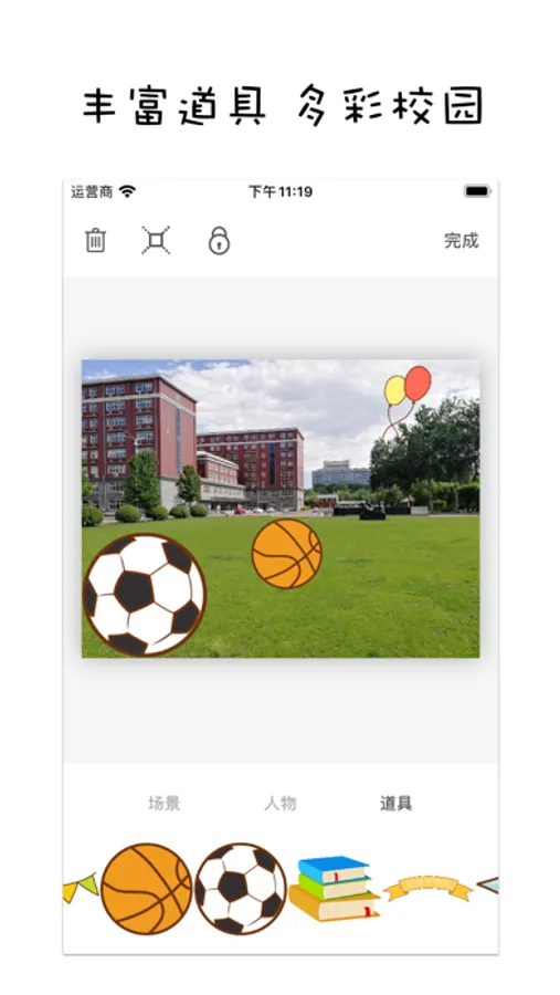 场景:内置了Q版校园场景,同时也可以上传真实校园场景,快来和你最心仪的校园场景来个合影吧!