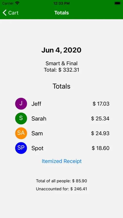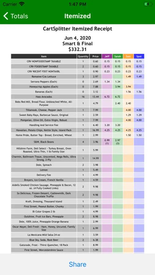 The scanner/inventory feature allows you to enter item names or scan barcodes as they are received. Cart Splitter will display and read aloud who the items should be distributed to while keeping track of the items which are scanned. Export and share itemized receipts so your friends can have complete confidence in the calculations.