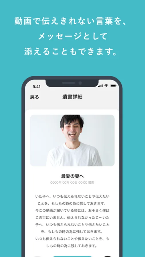 ■アプリでは、遺書動画が簡単に撮れ、アップロード、保存できます。遺書動画に付く遺書URLを大切な人に送ることで遺書を共有することができます。
