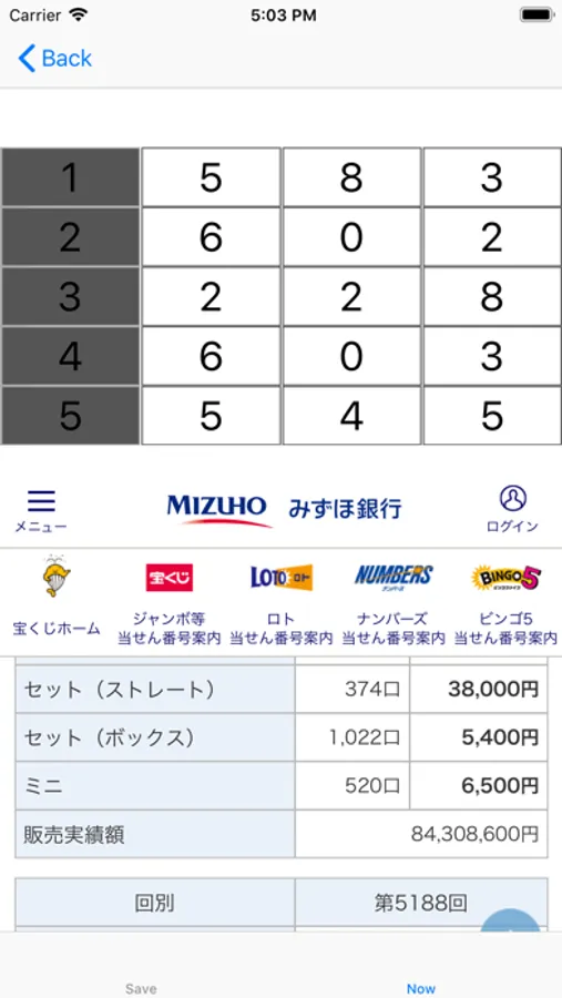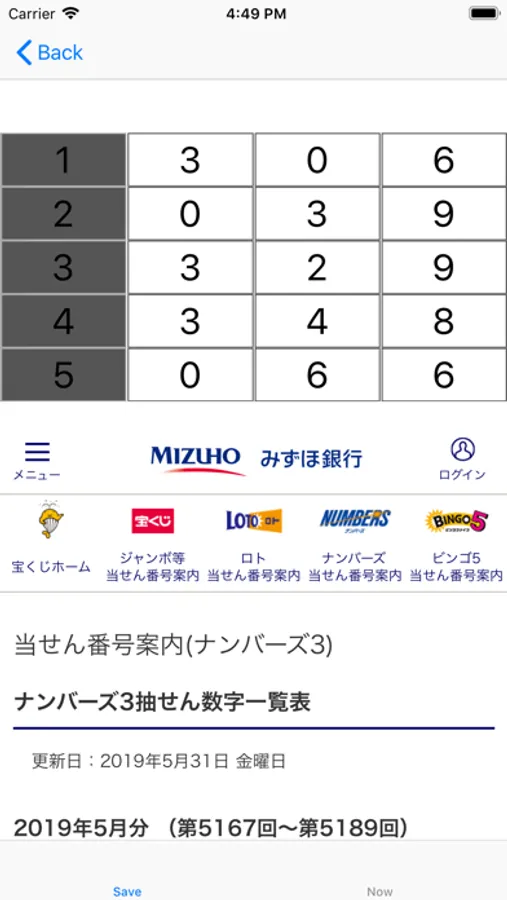 「W」をタップすると、Webブラウザが起動して、当選番号を確認できる「みずほ銀行」のWebサイトが表示されます。