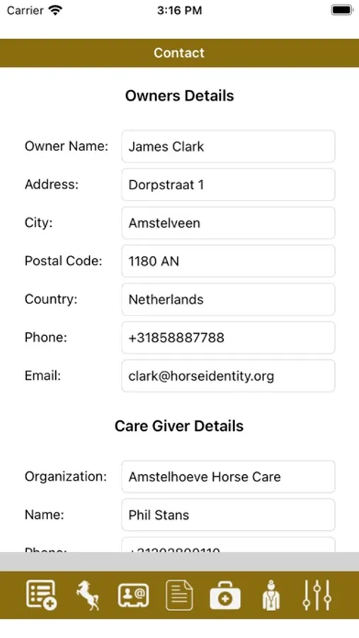 Upon signing up to the Horse Identity program using Horse-ID app, horse owners and caregivers will be able to administer and maintain information (horse profile) about their horses. This information contains horse records including identity, owners and caregivers contact details, medical and vaccinations, activities and trainings, veterinarian consults history.