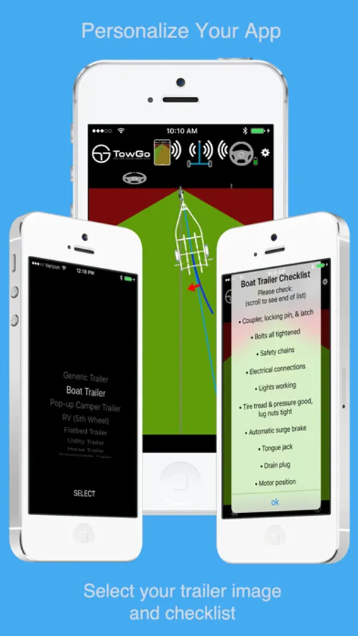Personalize your app. Select a trailer image according to the trailer type you are pulling. Boat trailer, RV, camper, 5th wheel, equestrian, snowmobile, and others are available. Trailer type selection also gives you access to a corresponding check list for that type.