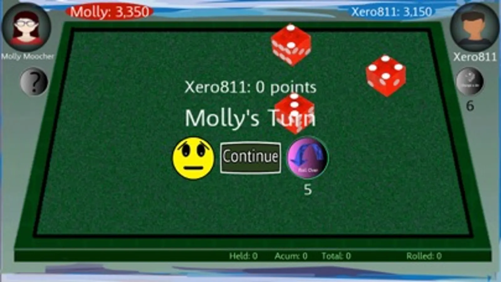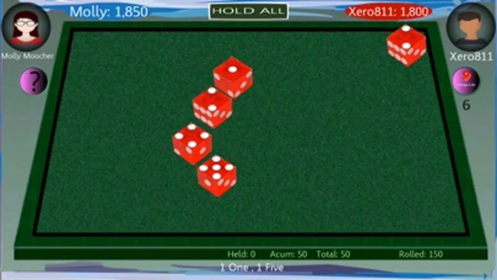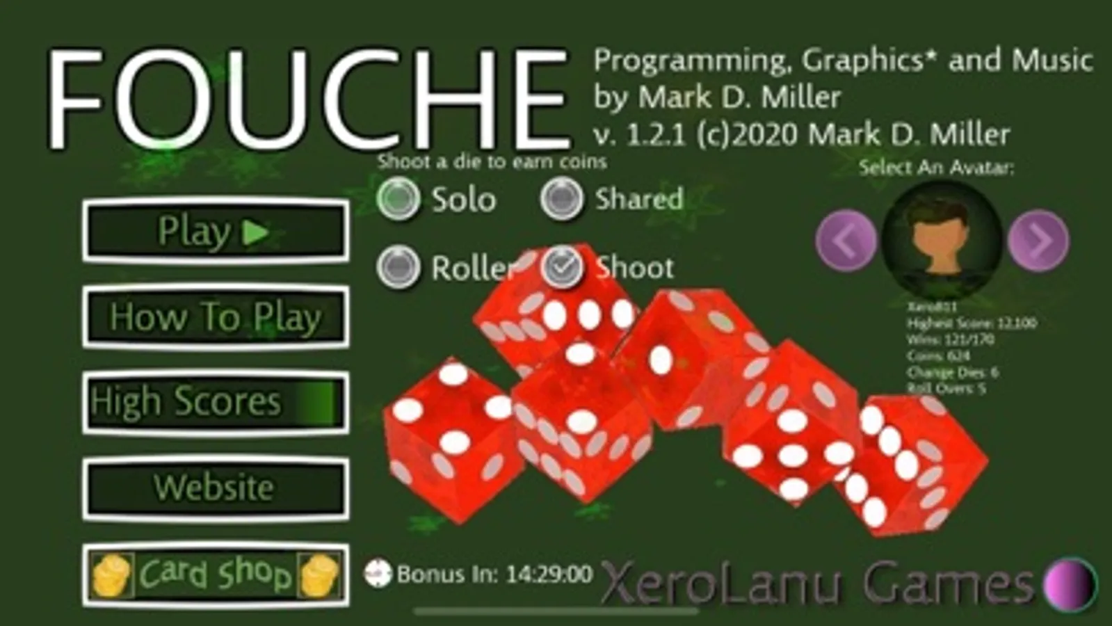 Fouche is a game played with six dice similar to Farkle and Dice 10,000. Scoring dice are set to the side and the remaining dice are rolled to continue the turn. If all six dice produce a score, the player may continue the turn with all six.