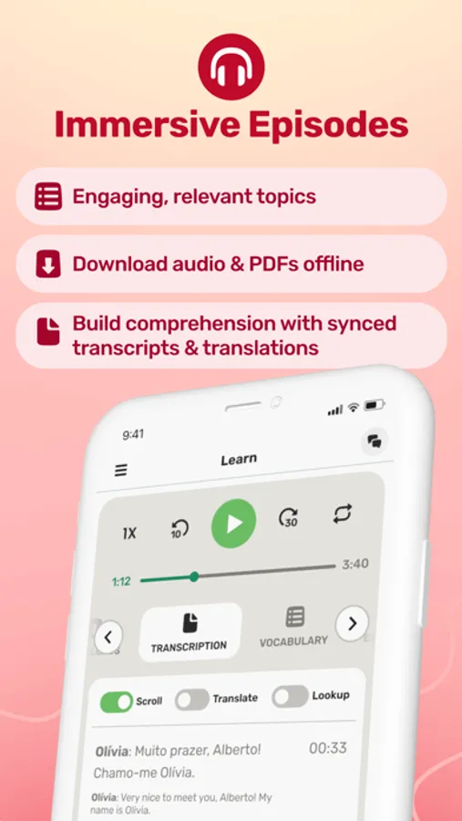 • Listen offline: Download dialogues and audio review sessions. (Note: Other features including transcripts, Smart Review, Lessons, and Learning Notes require Internet access.)