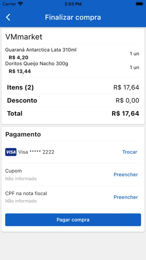 O VMmarket é um aplicativo criado para realizar compras em micromarkets, que são lojas de conveniências de autoatendimento disponíveis em condomínios residenciais ou empresas.