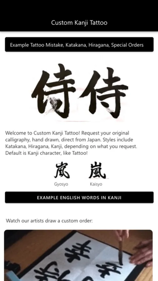 Use our app to explore kanji translations and request your original calligraphy, hand drawn, direct from Japan. Styles include Katakana, Hiragana, Kanji, depending on what you request. Default is Kanji character, like Tattoo!